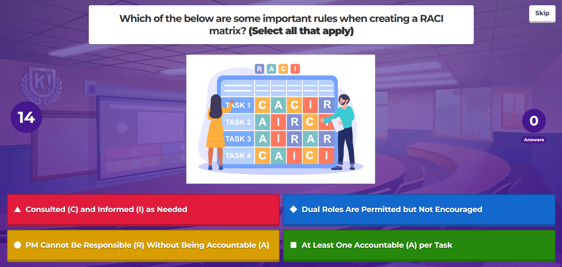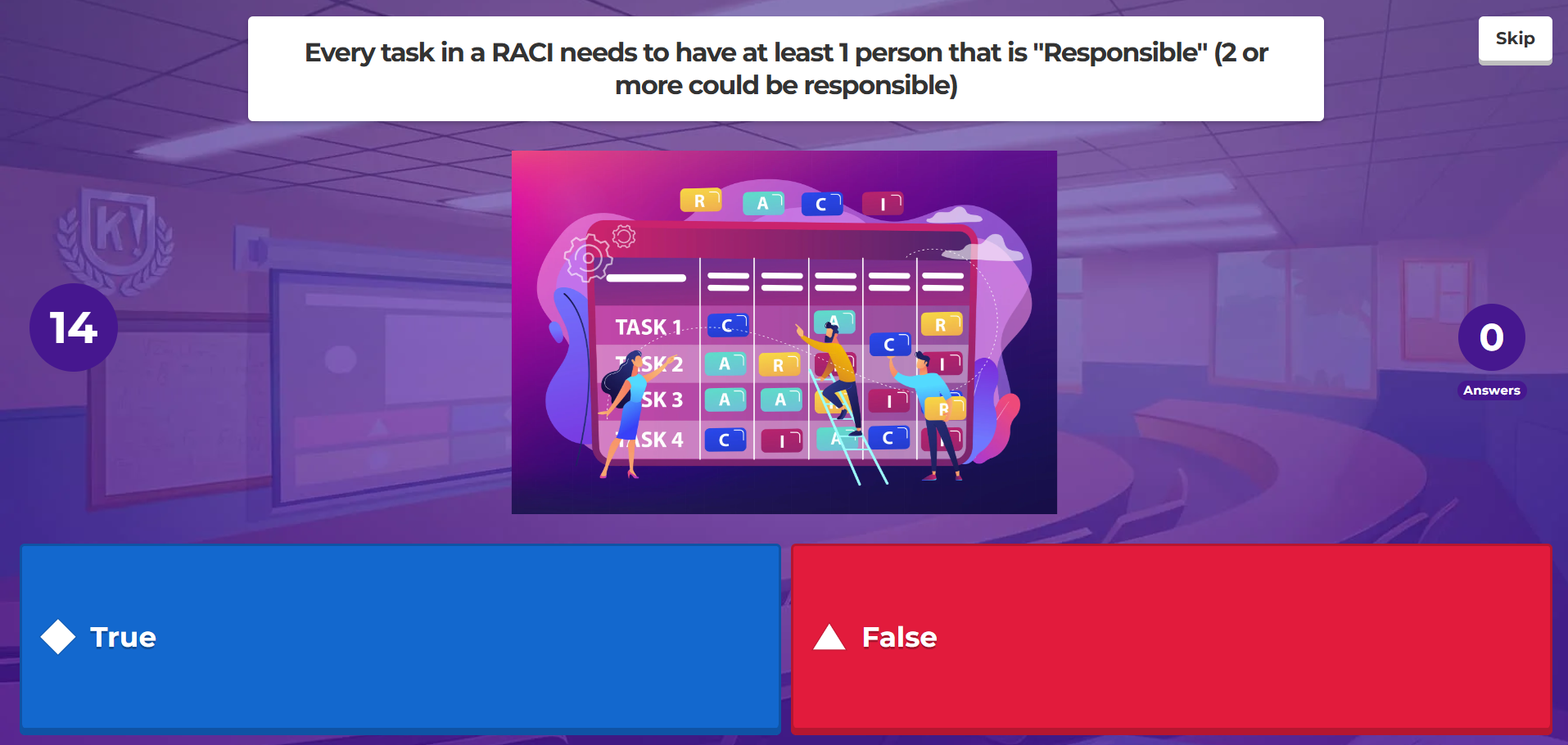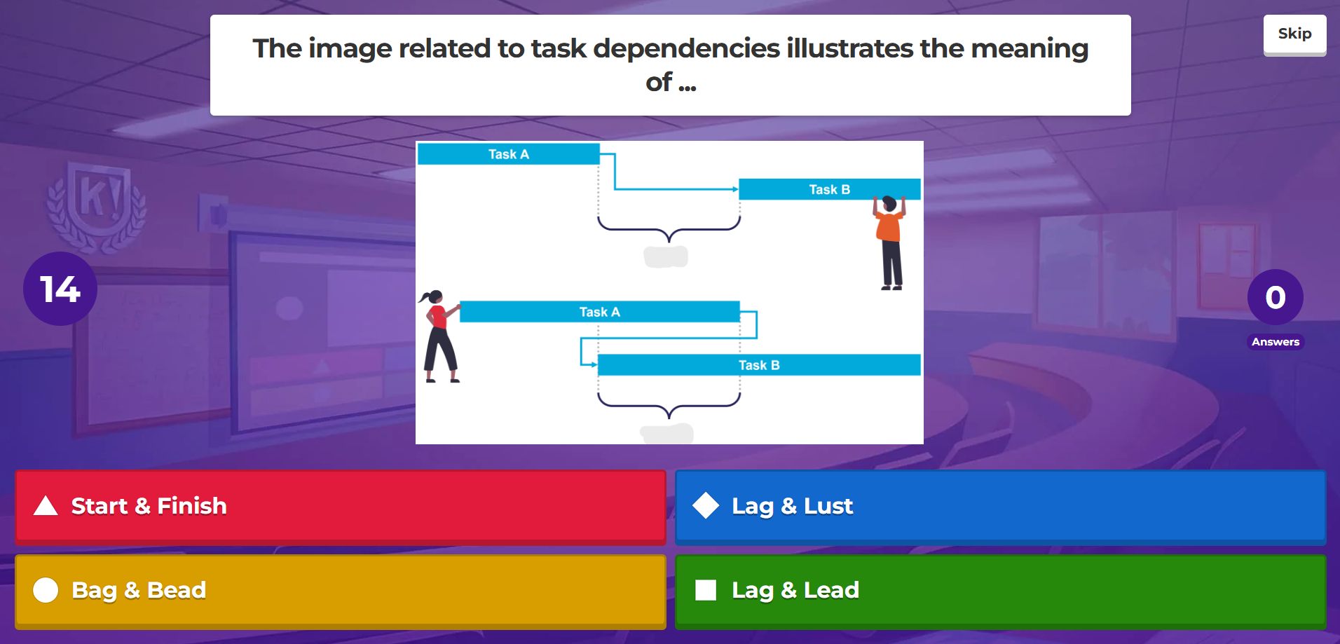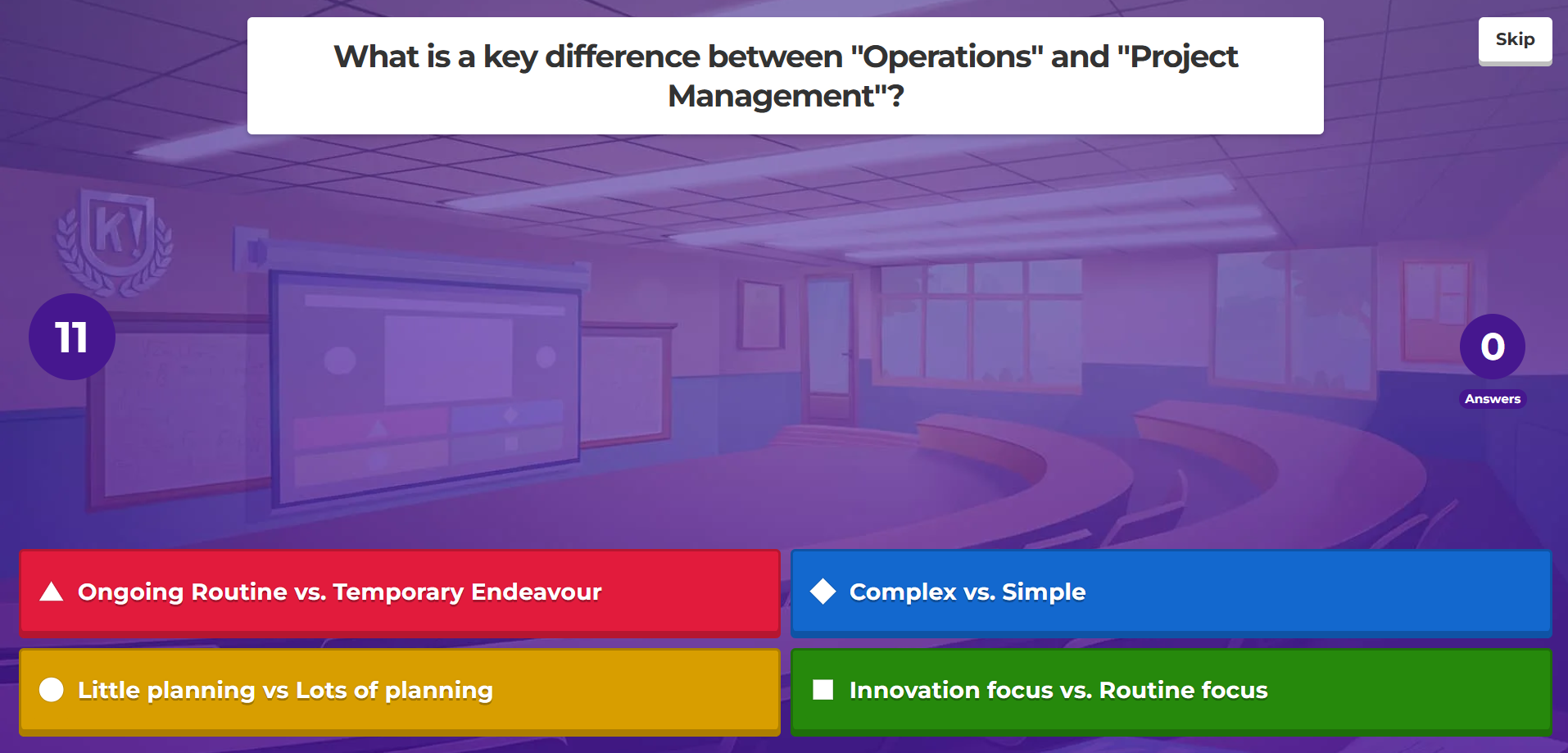 The aim of the observed part of the session is to summarise the previous 4-5 weeks of learning. Students were introduced to Project Management Tools in those weeks. The created quiz administered via Kahoot aims to help students check their learning and understand grasp of key concepts which will be required further down the line to complete their assessment brief.