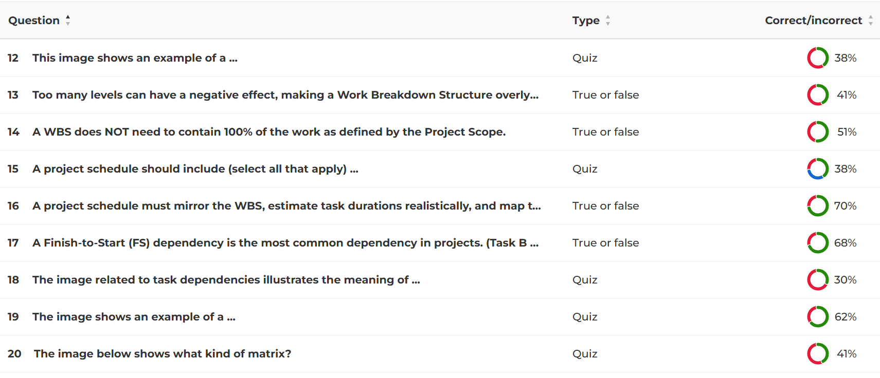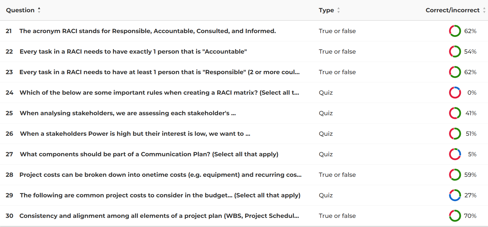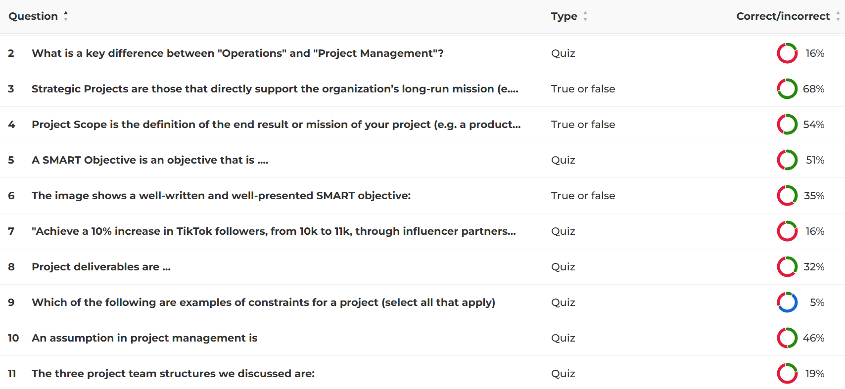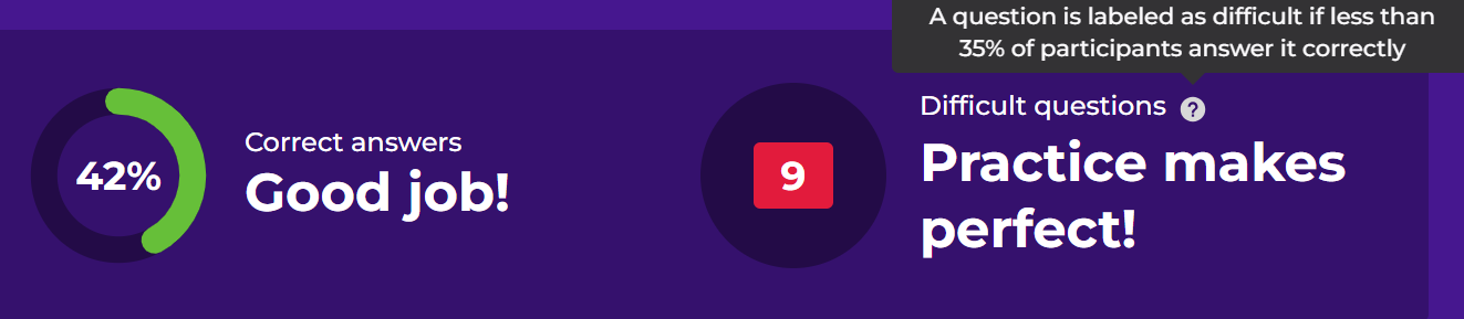 Kahoot provides in-app analysis of the questions' difficulty (based on how many participants answered each question correctly) and a percentage of correct answers for each question. Based on this data, several observations can be made: