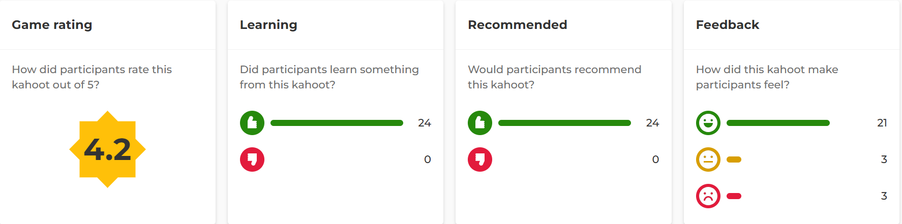 Kahoot provides the option to collect direct, quantitative feedback via the integrate feedback function at the end of each Quiz (see screenshot below). The overall game rating (4.2/5.0) by students suggest overall satisfaction with the quiz. While all students indicated they learned something from this Kahoot and would recommend it, some students indicated negative or neutral feelings towards the quiz (3 -neutral, 3 - negative, with 21 - positive). This could be linked to their performance on the quiz and will need to be addressed in future classes.