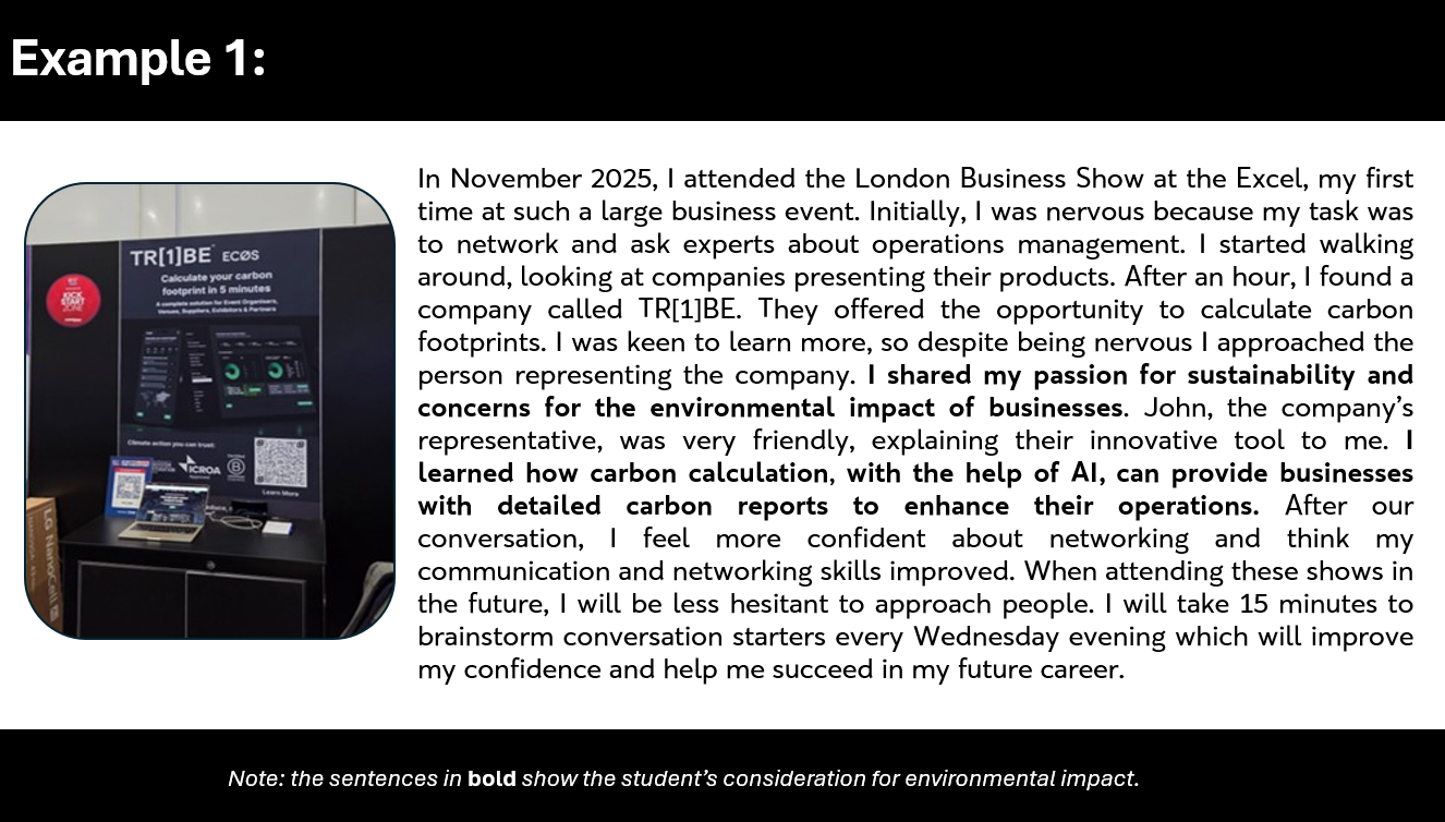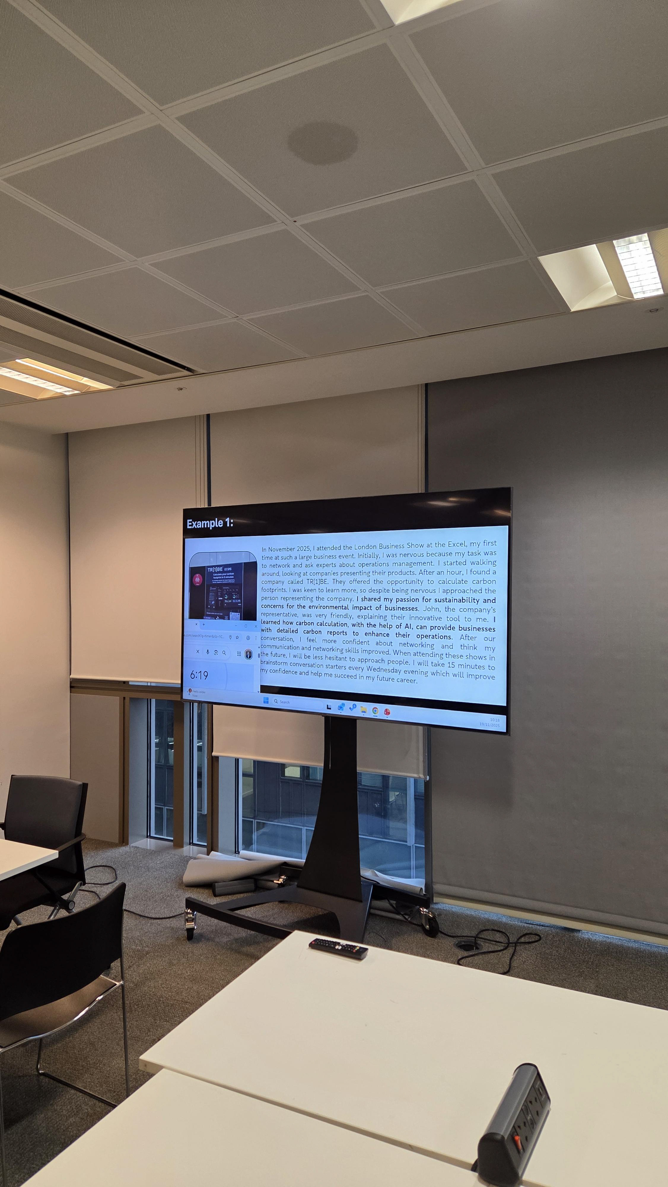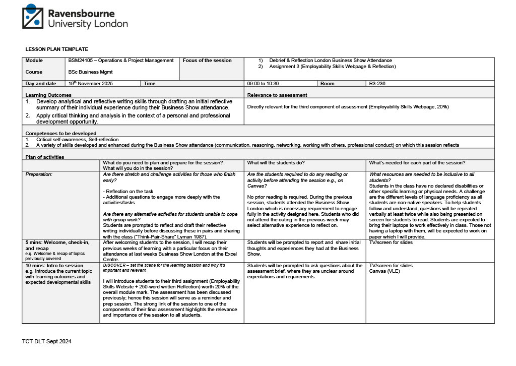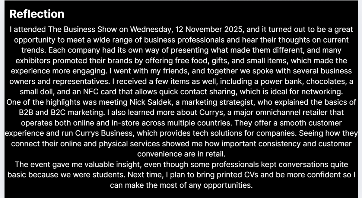The students are an international cohort in Year 1, 2nd semester of the BSc Business Management. The designed learning activity (90 minutes) was part of a longer 4-hour session held in Week 9, on the module "Operations and Project Management". The session focussed on employability skills and self-reflection following the students' attendance at the London Business Show 2025 at the Excel Centre on the 12th of November.