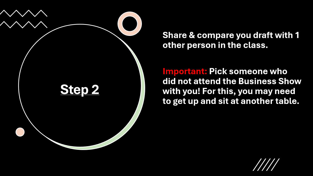 Incorporating Kinaesthetic Learning: As this cohort is particularly lively and chatty, I wanted to include aspects of kinaesthetic learning to see how students would react to physical movement and activation. Besides the actual writing (on paper or laptop) and use of their phones (to identify photographic evidence), I asked students to get up, walk around, and share their drafts with students they had not previously (or barely) spoken to before to break up the usual classroom seating arrangements and challenge students to get out of their comfort zone (i.e. discussing only with their closest peers). Interestingly, the students were rather apprehensive at first to get up, move around the room, and approach others who they have not worked with before. I encouraged the class as a whole 2-3 times before directing individual groups of students to start moving around the room and look for others to share their work with. Considering their experience in class to date and the students' background, I believe the invitation to leave their seats and wander around to engaged with others was very new to them, which was cause for the initial reservation. Once the first students were beginning to move, the majority of students joined in and found new peers to share their work with.