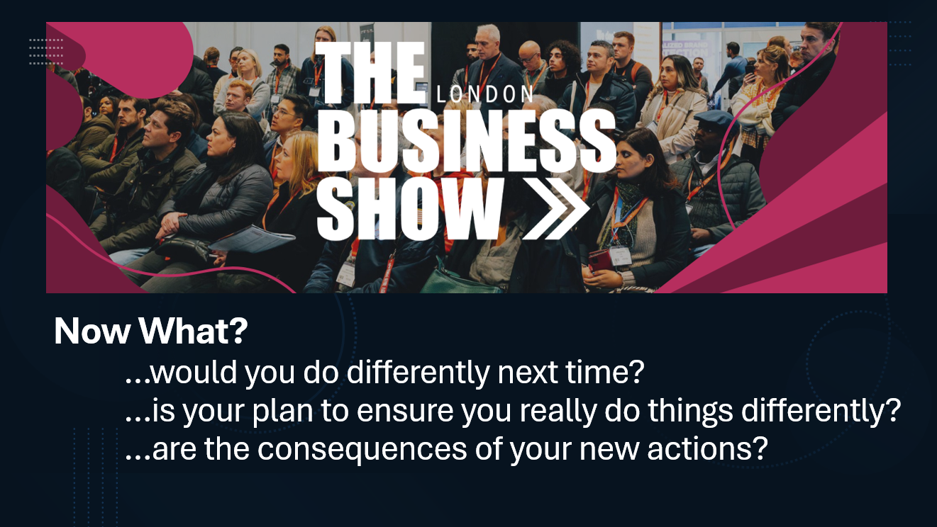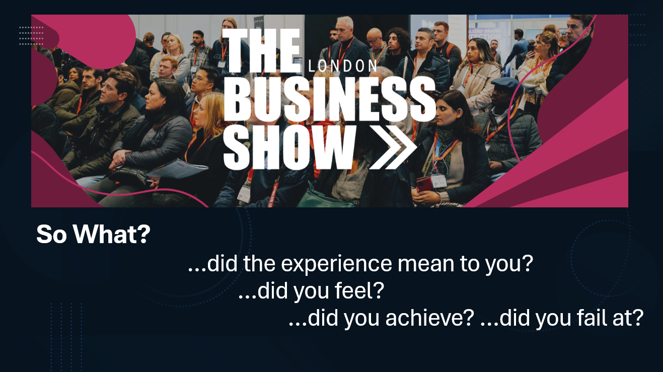 From here, I guided students back toward thinking about their experience the previous week at the London Business Show. As a class, we considered and shared the "What?", the "So What?", and the "Now What?" of our experience (see the three slides above). A number of students participated in sharing their experiences with the class while others, naturally, held back and preferred to listen to others sharing. I subsequently introduced Rolfe's Reflective Model formally, outlining the meaning of all three components, key questions to ask for each, and how it can help structure the students' reflective writing.