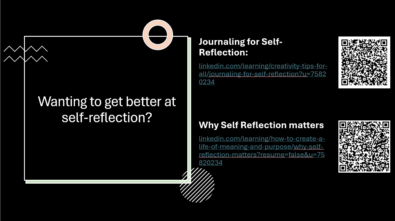 After a short break for questions, I then introduced students to the learning activity, which I had designed based on the "Think-Pair-Share" approach (Lyman, 1982) as mentioned above. The slides I used to guide students through the activity are included below. They include six slides, introducing: Step 1 (Think) - Examples 1 and 2 - Step 2 (Pair) - Step 3 (Share) - Next Steps/Future learning). The final slides on next steps/future learning suggest two LinkedIn Learning Courses on self-reflection and journaling which students can engage with as part of the independent study hours to further develop their employability as well as reflective writing skills.