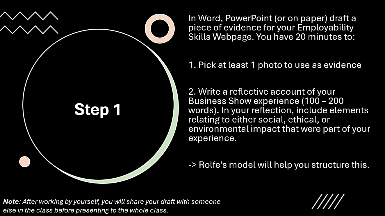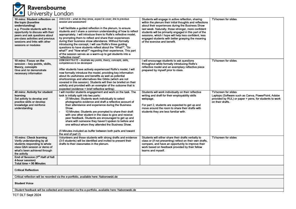 The aim of the session was to help students develop analytical and reflective writing skills through drafting an initial reflective summary of their individual experience during their Business Show attendance and to apply critical thinking and analysis in the context of a personal and professional development opportunity. The learning activity is strongly linked to the summative assessment as students are required to further develop their Employability Skills Webpage and produce a 250-word reflective rational on their skills development during the module. I created the below lesson plan as part of planning this learning activity: