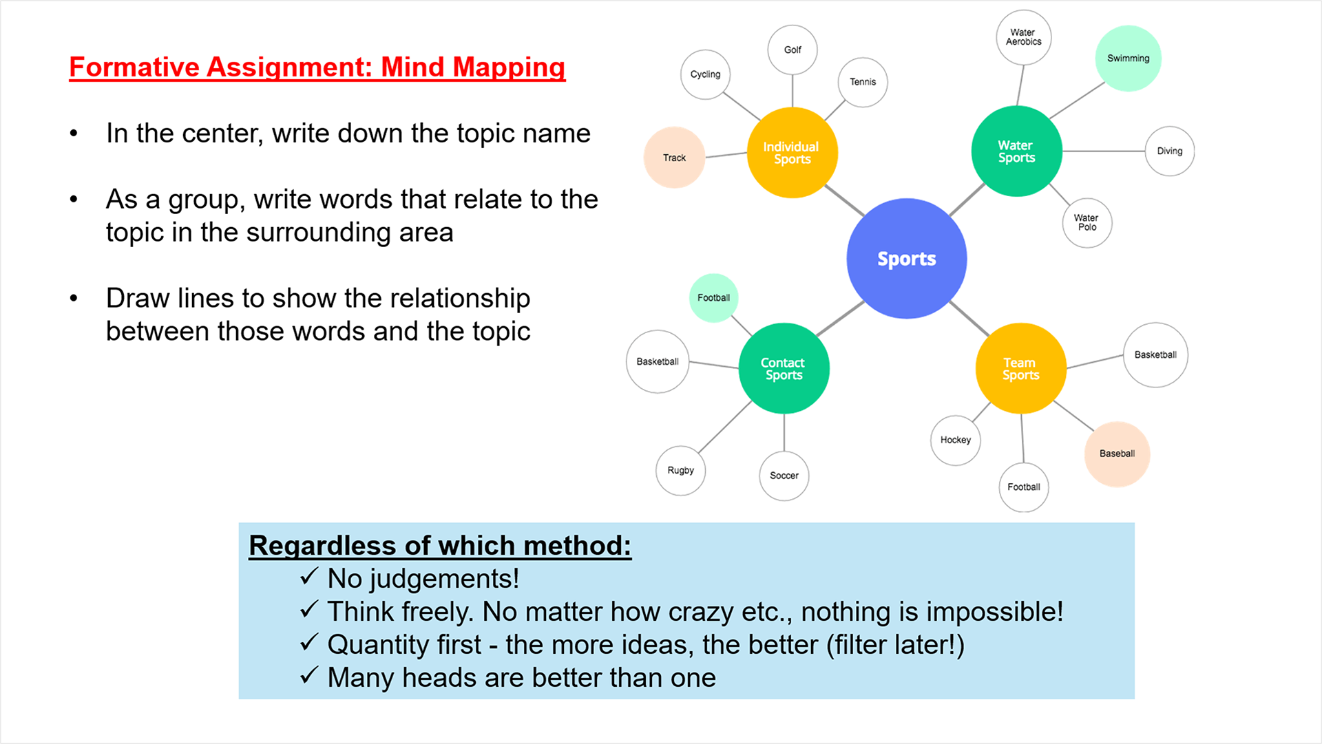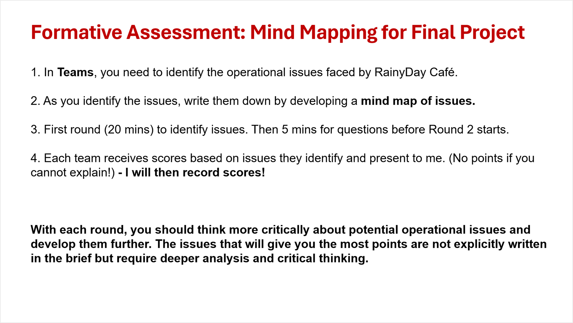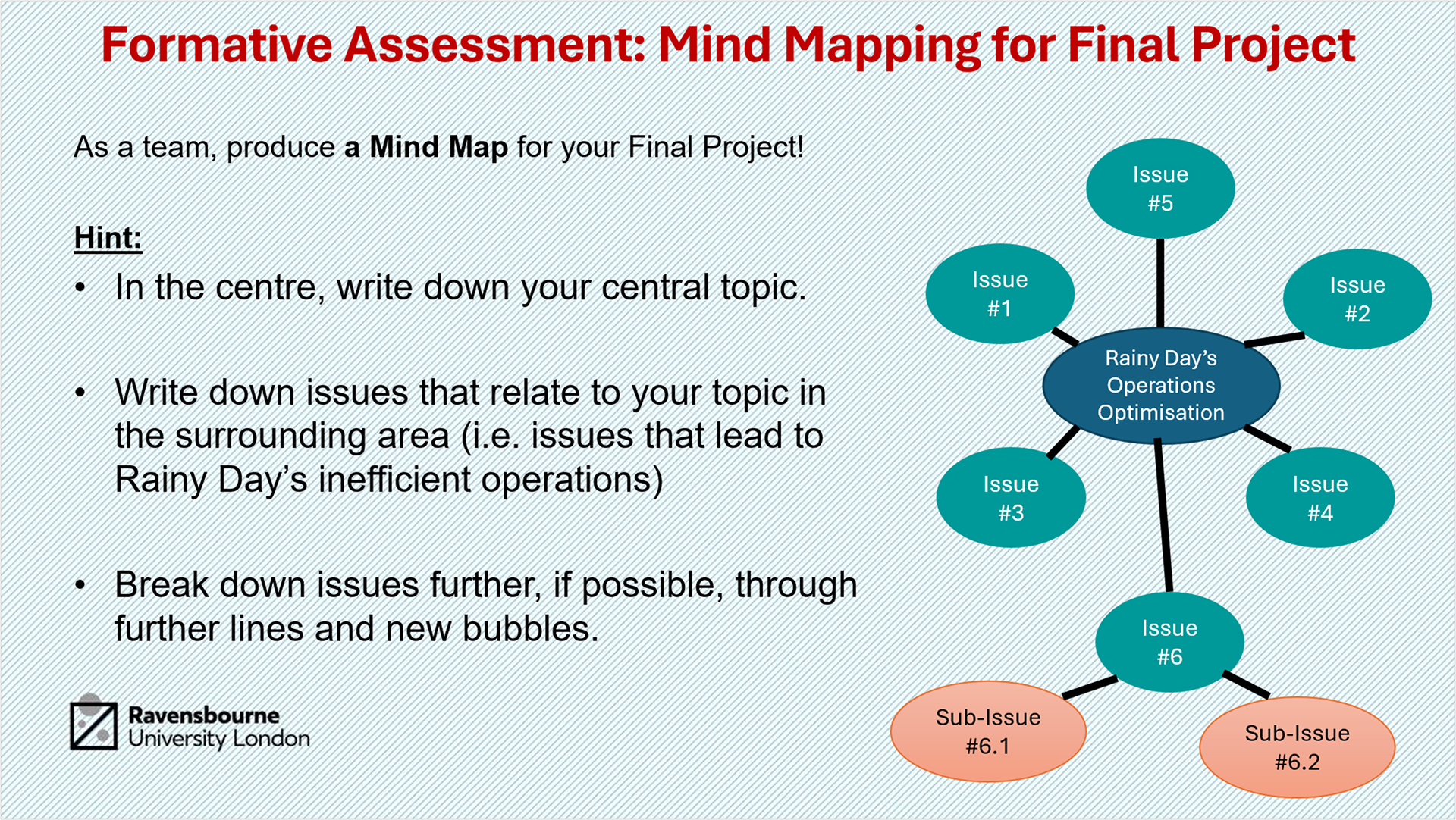 The aim of this Week 7 session was to conduct the formative assessment and gauge students’ understanding of the Operations & Project Management content to date. Students were introduced to the formative assessment task before being guided throughout the session toward completion. The formative assessment includes compiling an extended mind map of operational issues faced by the imaginary project client (RainyDay Café) over several rounds. The accompanying slides (which I used and had put together at short notice prior to the session) and the scoring sheet (shown to students during the session) are shown below: